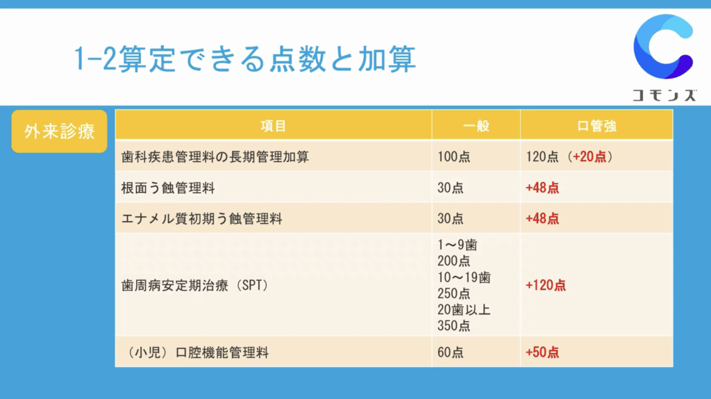 加算される点数だけでなく、口管強を取得することで、算定頻度も増えますので、施設基準を取得することとしないことでの加算に大きな差が生まれるとのこと。