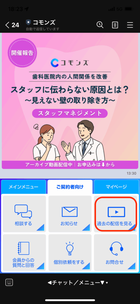 公式LINEメニューの「ご契約者向け>過去の配信を見る」にアーカイブ動画URLが配信されます。