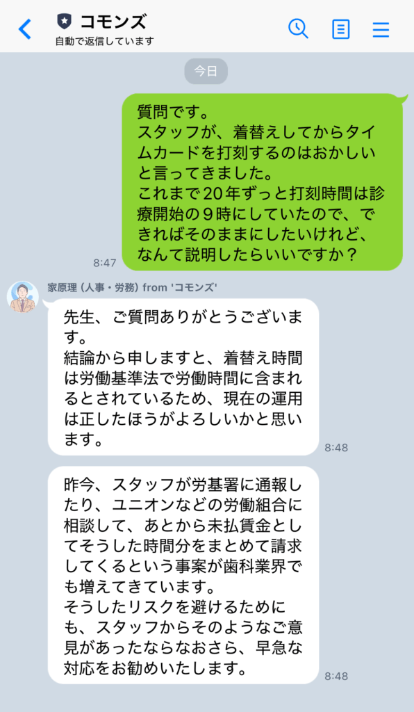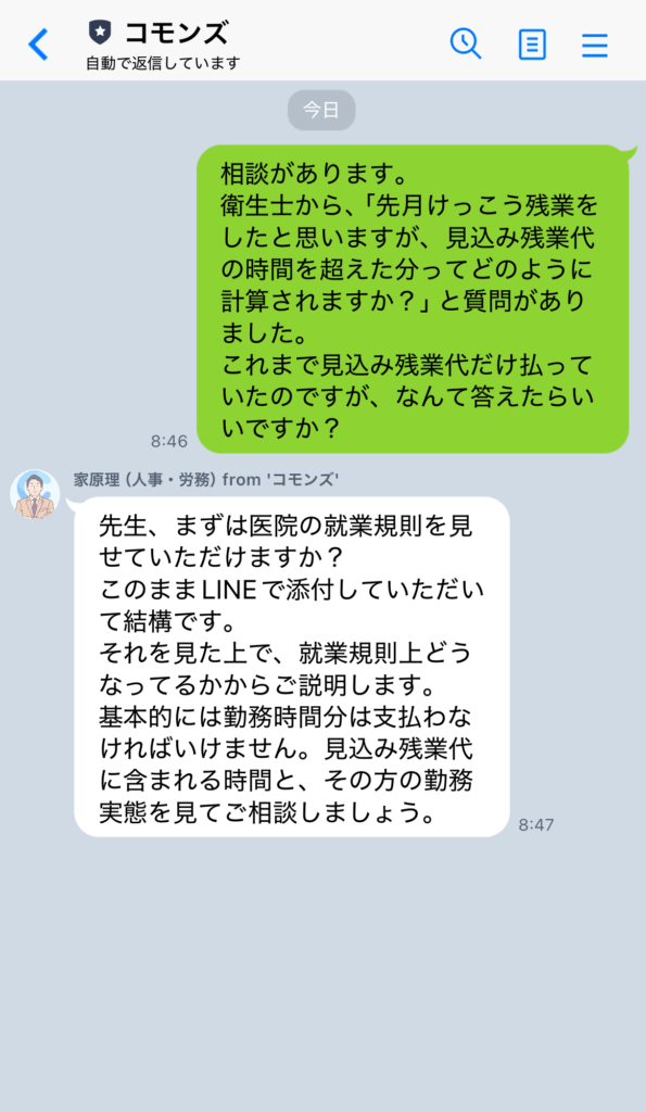 そこでコモンズでは、チャットでの労務相談、情報提供、他医院からの質問等の情報共有で月額10,800円いただきますが、それ以外は「発生した時に発生した分だけ」の料金体系をとっています。(パートナー社労士法人との直接契約になります)